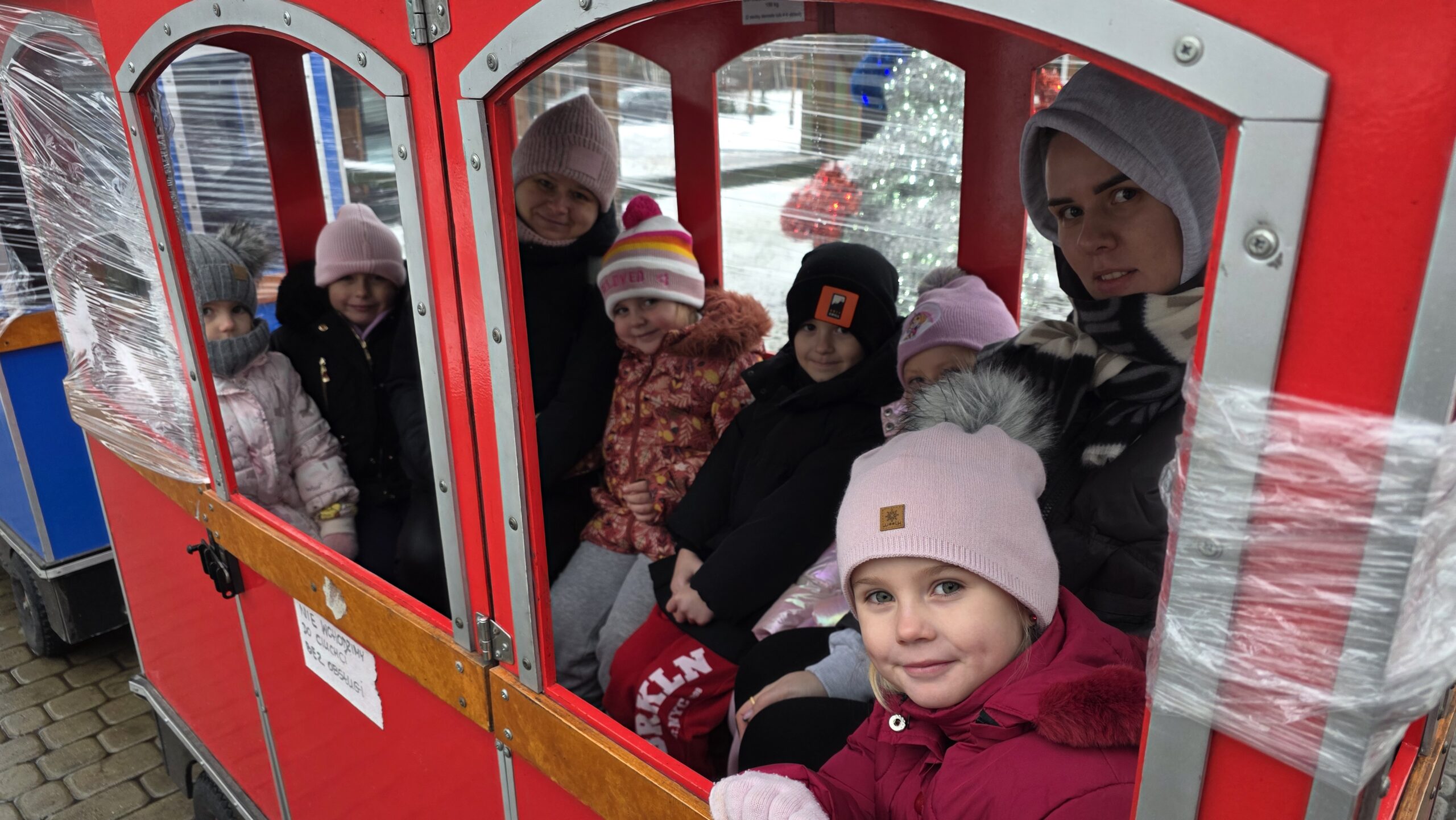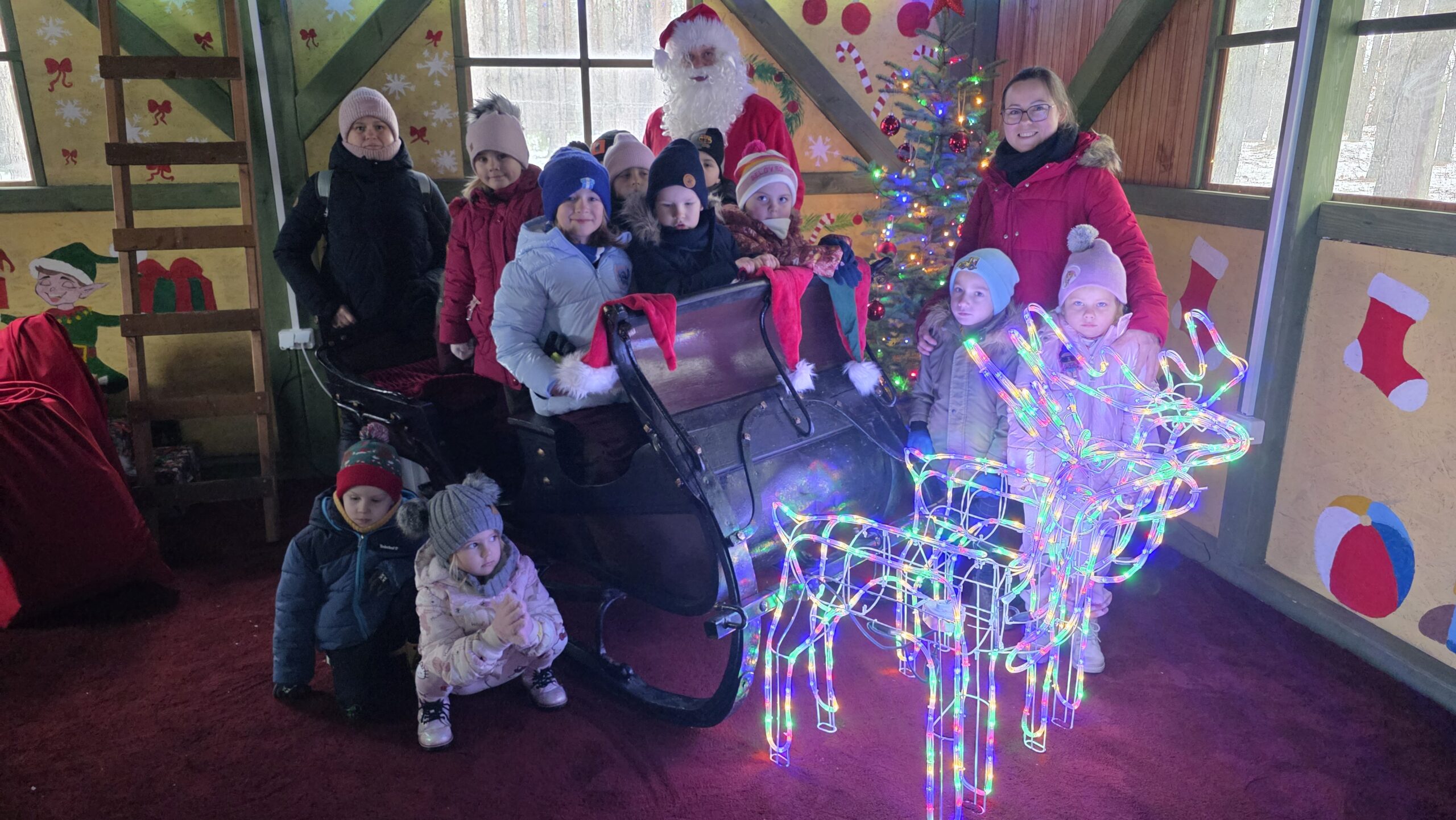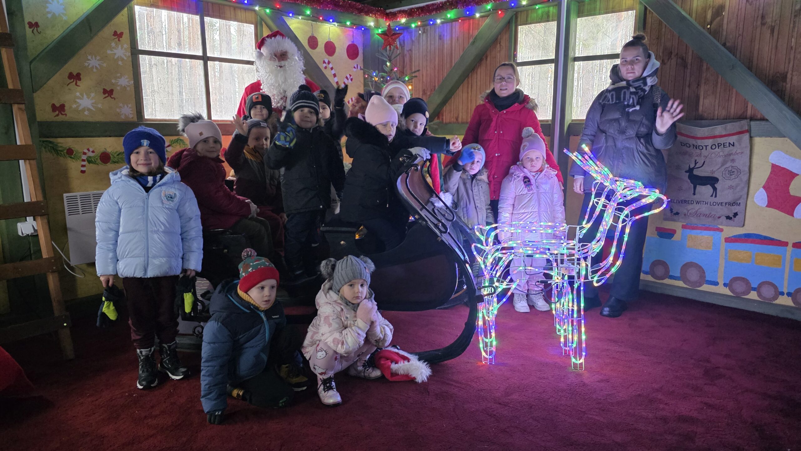 Przedszkolaki uczestniczyły w warsztatach, pt.: „Pierniczki i Wioska Świętego Mikołaja” w Budach Iłowskich. W ramach wydarzenia dzieci lepiły pierniczki, spotykały się z Mikołajem, jeździły świąteczną ciuchcią oraz miały okazję karmić zwierzęta.